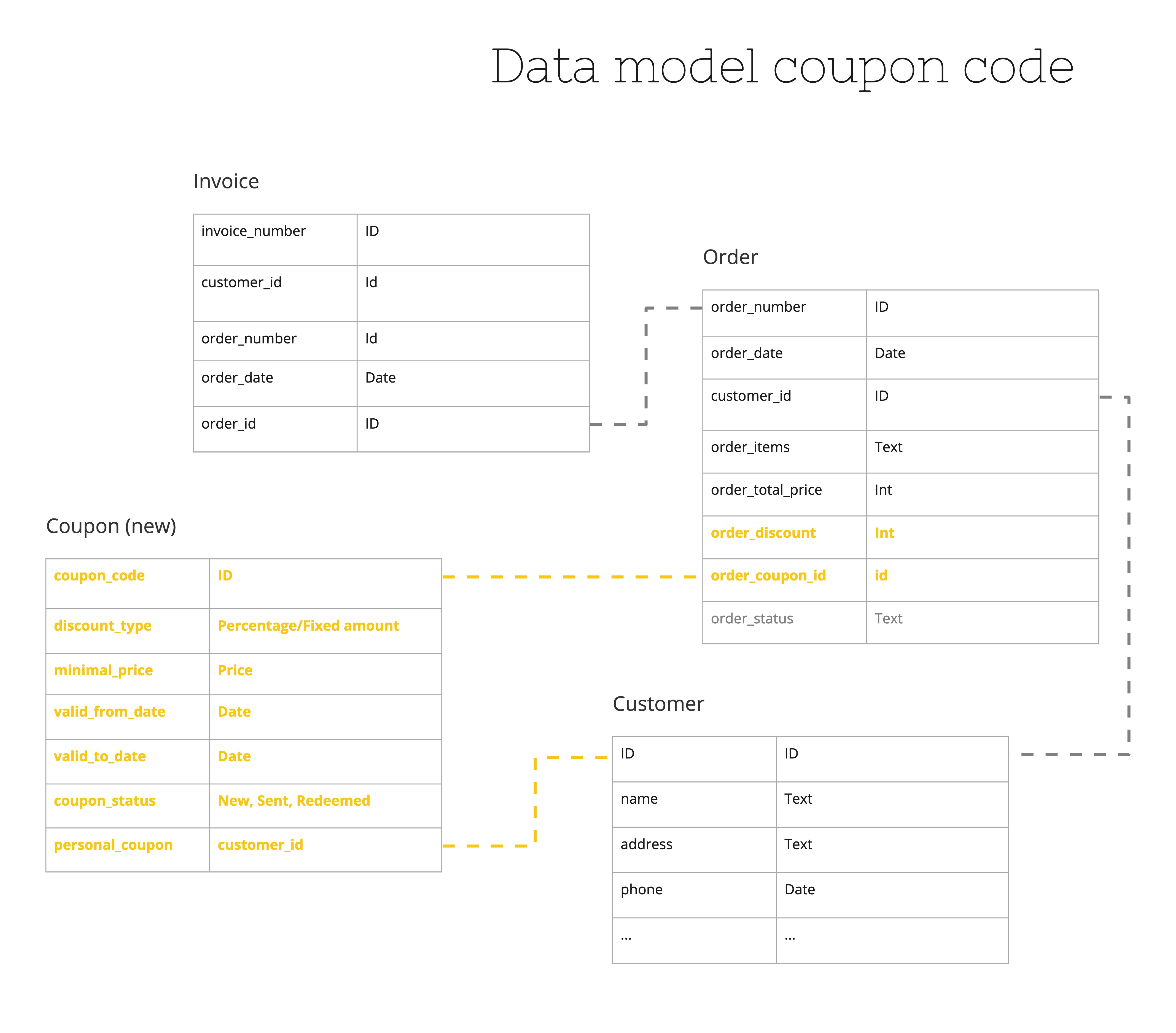 We now have the flow our users will follow and we have designed how this will work and what it will look like. Now we just have to think about data: What fields will it contain? Does it have dependencies to other things? What changes in other entities will be needed? We call this the logical data model. Creating and/or understanding the logical data will improve your understanding of the application and the logic behind it.