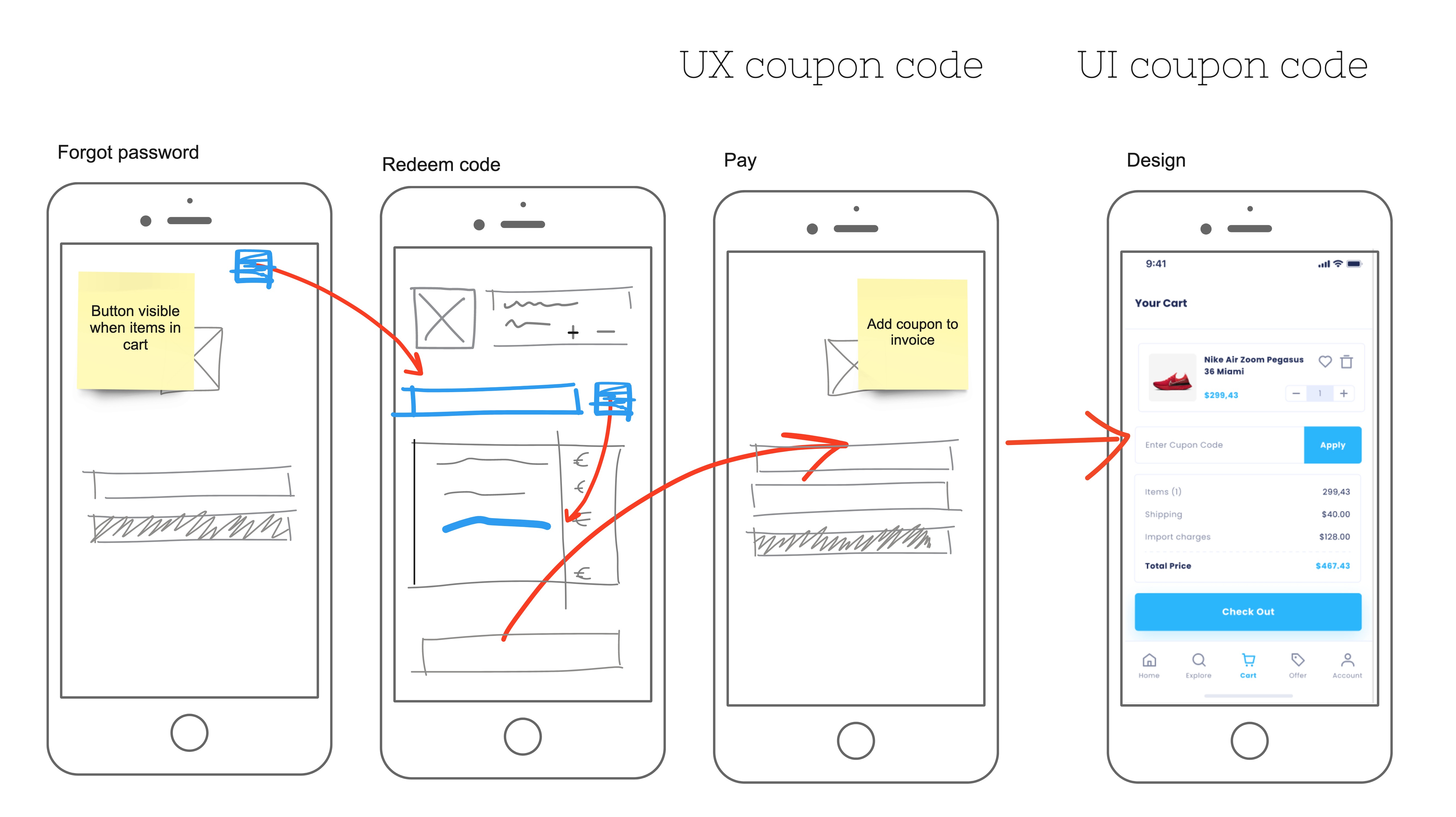 Since we now have a global understanding of the functionality and the flow we can start thinking about the best experience for the user. It often goes both ways: you make a UX based on a flow but learn a better and smarter way to solve the problem. This will often result in adjustments in the flow. Often even for the goals. This is also perfectly fine in this phase: you are creating something and that means a lot of learning and revisioning.