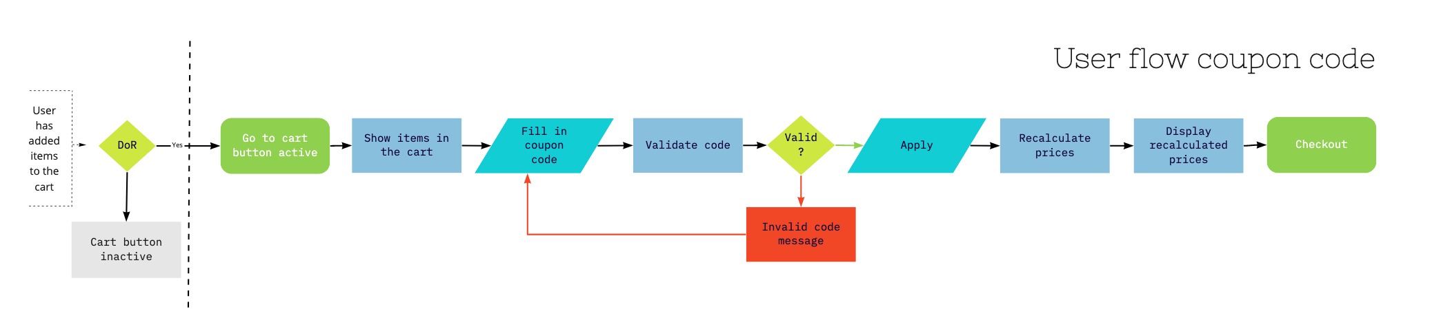 With the user flow we describe the simplest path (happy path) and what I call extensions (edge case) to this path. You can already recognize subjects that are related to testing.