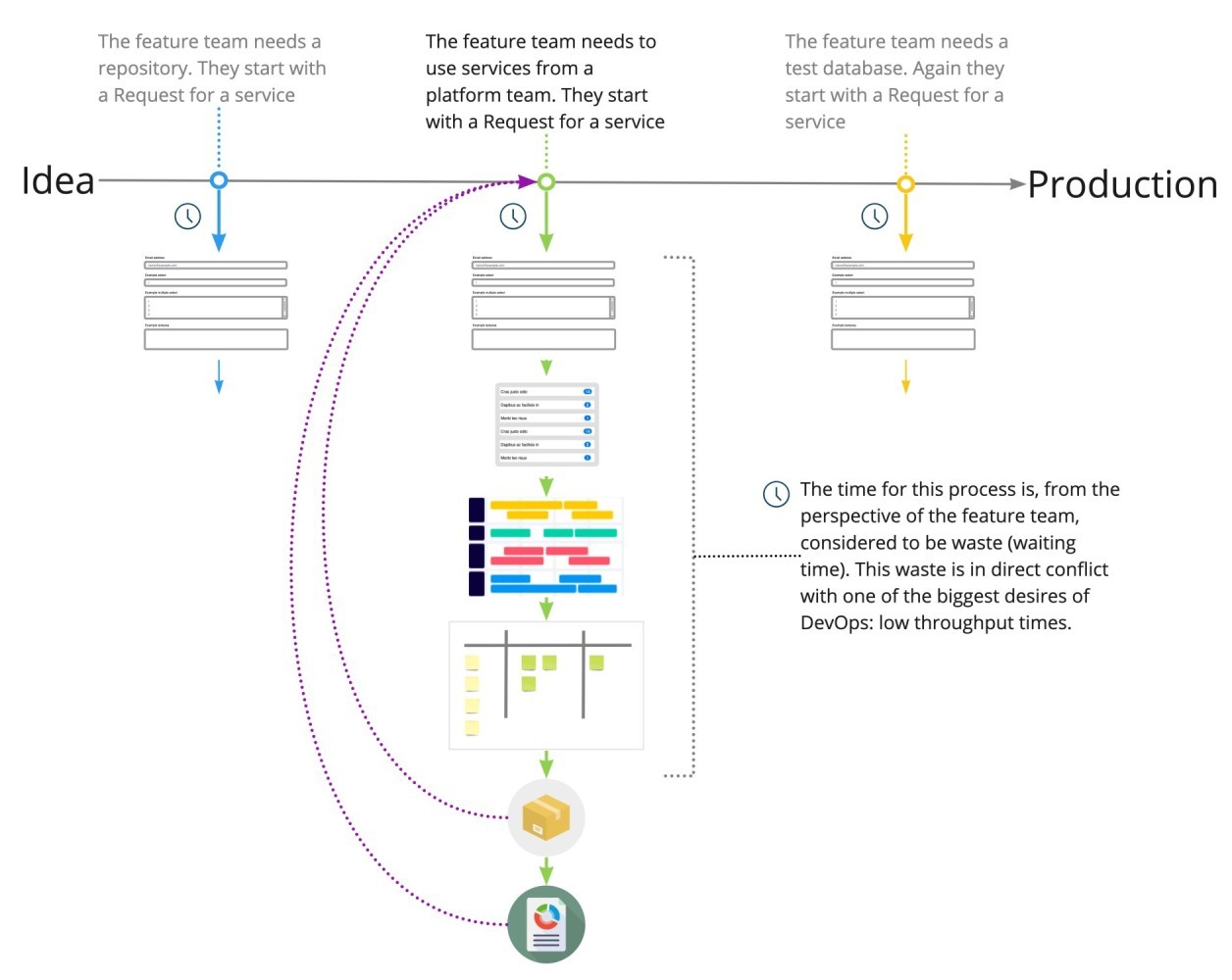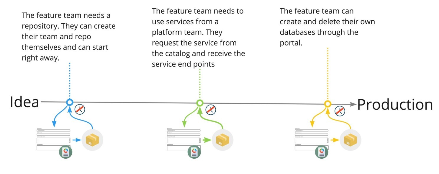 In this example, the platform and sub-system teams have a catalogue of products and services that other teams can use. The request and the fulfilment of it are automated. Requests that are not in the catalogue yet will be done manually while also added to the roadmap. When worthwhile it can be added to the catalogue. This way the catalogue will grow based on user demand.