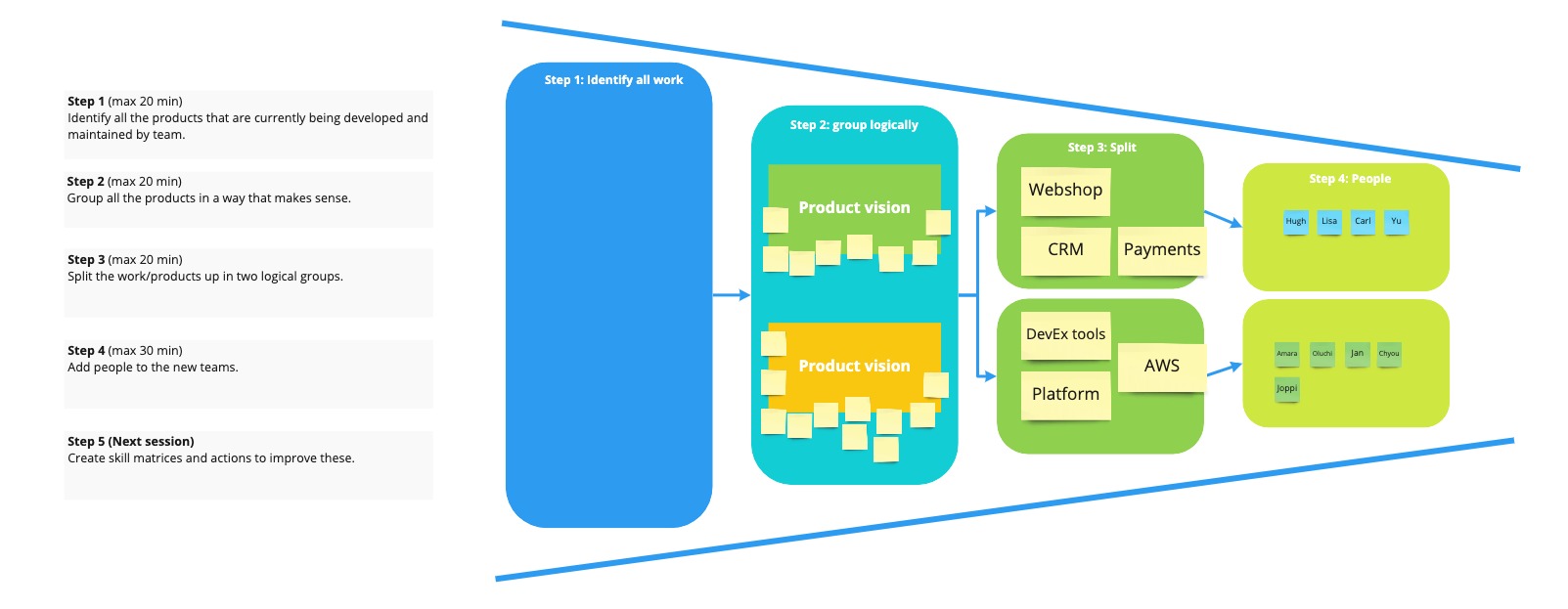 A specific example is customer implementations or projects for instance. The types of work in general are relatively simple implementation tasks and maybe some product related rfc’s. In that cases the split of the team can be based on the type of work: either implementation or product. Both types of work have their own processes and management.