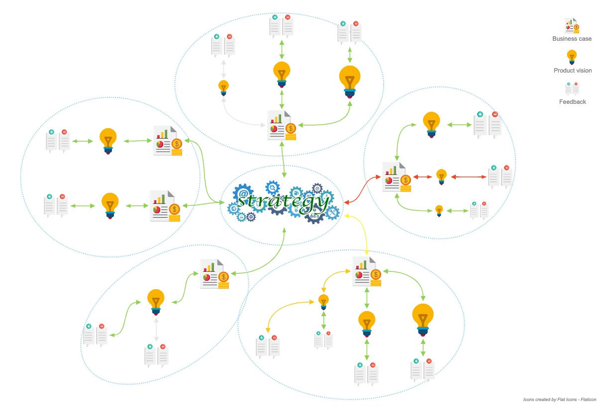 In practice you rarely see the relationship with the strategic goals and, more importantly, the right conversations about what each epic or feature will contribute to the overall strategy. This makes it very difficult for everyone to understand what is really desired and what goals should be pursued.